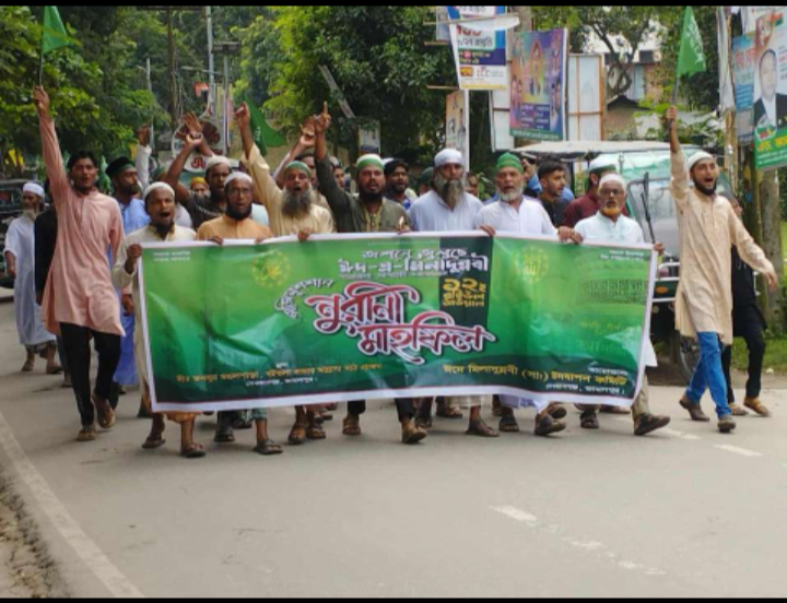 দেওয়ানগঞ্জ উপজেলা শ্রমিক দল ও ভক্ত-আশেকানরা শৃঙ্খলাবদ্ধ হয়ে মিছিল করেন।