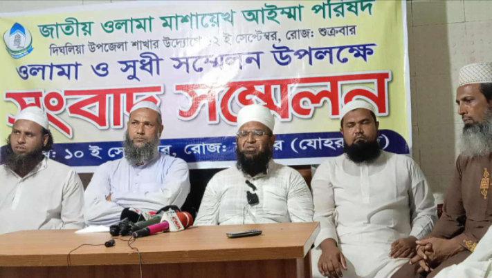 খুলনার দিঘলিয়া উপজেলায় জাতীয় উলামা মাশায়েখ আইম্মা পরিষদের উদ্যোগে এক সংবাদ সম্মেলন অনুষ্ঠিত হয়েছে। (১০ সেপ্টেম্বর) বাদ যোহর দিঘলিয়া রহমানিয়া মাদ্রাসায় এই সংবাদ সম্মেলনের আয়োজন করা হয়।